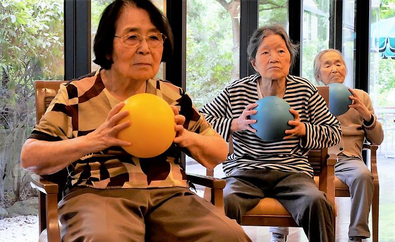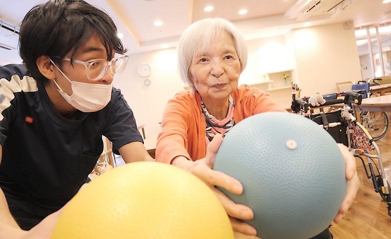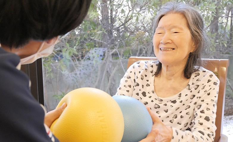2025.09.18介護度進行予防運動当ホームで通常毎週2回実施している介護度進行予防運動。この日はボールを使った運動を行いました。運動の専任スタッフとボールを押し合ったA様。最初は「私にもできるかしら?」と少し不安そうな表情をされていましたが、いざ行ってみると「ちゃんとできたわね」とにこやかな表情を見せてくださいました。