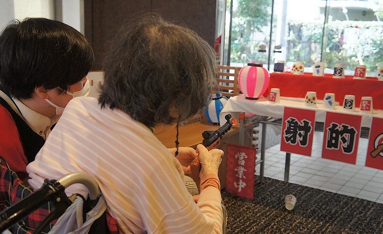 2025.09.29夏祭り~射的~当ホームで行った夏祭りでは、射的コーナーをご用意させていただきました。球が当たるとギャラリーも大盛り上がりで、皆様は楽しそうに射的で遊ばれていました。当たった数に応じてチョコレートなどを景品としてお渡しさせていただき、皆様は何個獲得されたか競い合っていらっしゃいました。