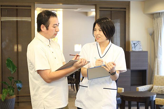 介護職員はもちろん、看護職員を24時間配置し、夜・緊急時の医療的ケア(診療の補助)もご相談可能です。医療従事者として主治医との懸け橋となり、日々の体調管理を支えています。日々のご入居者様との会話などから些細な変化を見逃さないよう、体調の変化に気づけるよう介護職員と密に連携をとりながらサポート。健康に関するご相談やお悩みはもちろん、世間話などお気軽にお声かけいただき、コミュニケーションも大切にしています。