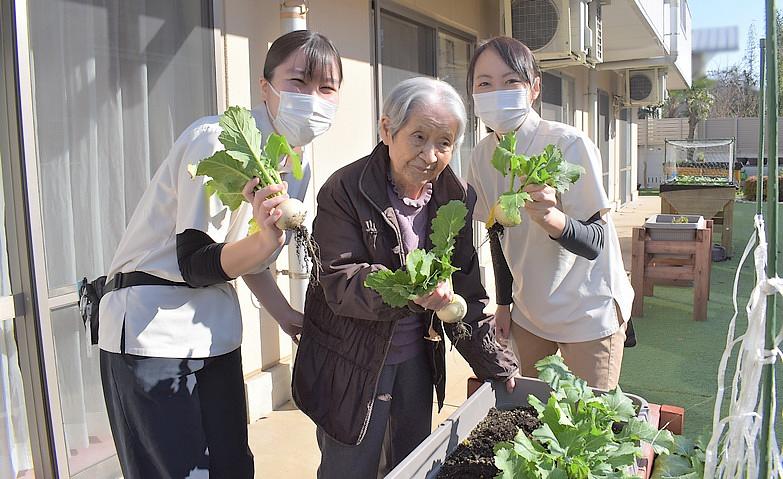 ホームの畑までスタッフが一緒に行き、収穫した野菜で料理をしています。介護保険給付基準を上回る2:1以上の手厚い人員体制でサポートしながら、ご本人様のできることはやっていただき、その方のお力を発揮していただけるような機会を設けるようにしています。