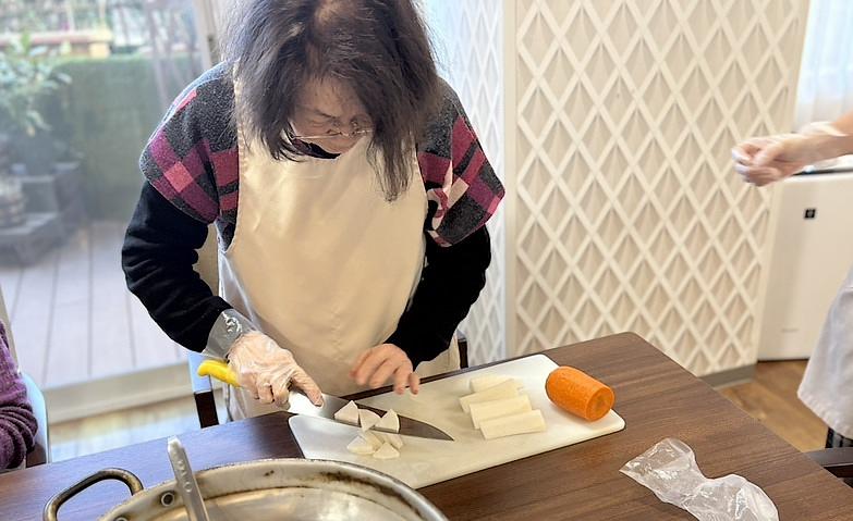 当ホームではティータイムがより楽しみになるようなお菓子作りのアクティビティを定期的に実施しています。パフェやフルーツゼリー、ホットケーキなどティータイムにご入居者様同士でワイワイ楽しめるようなスイーツが人気です。ご入居者様に作っていただくことで、お菓子作りの工程からティータイムまで会話も弾むような、お茶の時間がより充実したものとなるような企画をご提案しています。そのほか、お料理が得意な方はお菓子だけでなく、お料理に挑戦していただいたりと、ホームの中で「食」がより楽しみになるような工夫をしています。