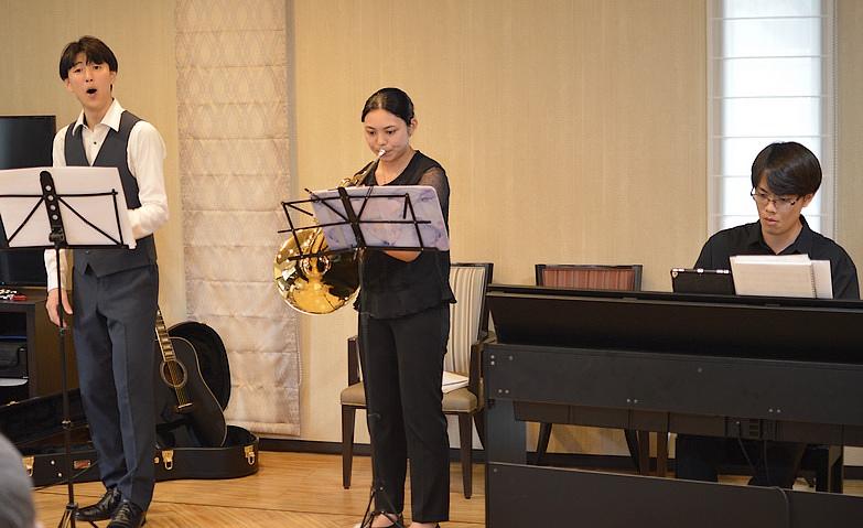 2025.08.17オペラ&ホルン&ピアノコンサート当ホームの恒例イベントとなっている、音楽大学の生徒の皆様による演奏会。今回はオペラとピアノに加え、ホルンがハーモニーを支えるすてきな演奏を披露してくださいました。ダイナミックな場面から繊細な表現に至るまで、豊かな音色が織りなす名演の数々に、参加された皆様の拍手喝采が鳴りやむことなく、ダイニングルーム兼機能訓練室に響き渡っていました。
