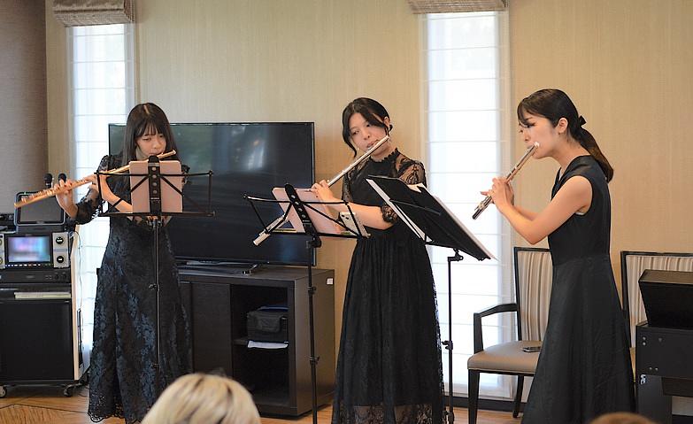 2025.08.02ピアノ&フルートコンサート当ホームの恒例イベントとなっている、外部よりお招きした音楽大学の生徒の方々による演奏会。今回は、美しいピアノの調律とフルート三重奏を披露してくださいました。やわらかく温かみのある音色が織りなす名曲の数々に、ご入居者様だけではなく、お越しくださった多くの地域の皆様も、感慨深そうに聴き入っていらっしゃいました。