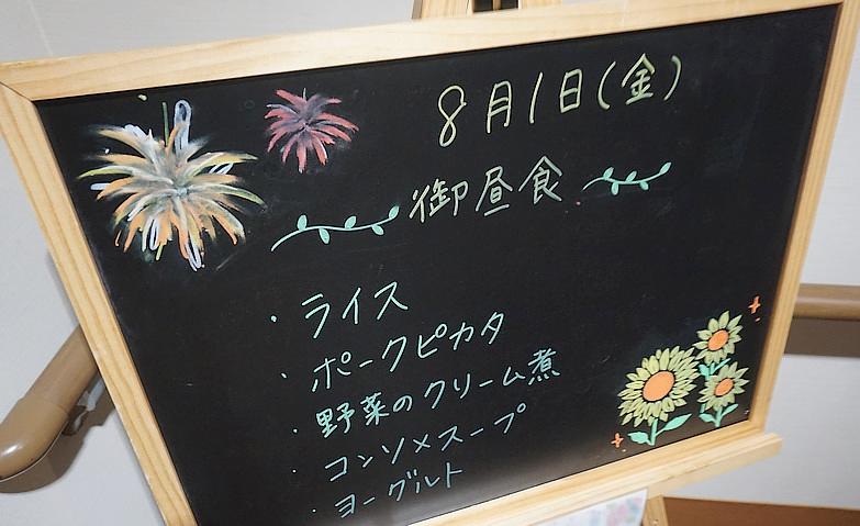 2025.08.03夏らしいメニューボードになりました!8月に突入し、いよいよ本格的に夏になりました。絵が得意なスタッフが心を込めて、夏らしいヒマワリや花火のイラストをメニューボードに描きました!ボードをご覧になったご入居者様は、「季節を感じられるから見るのが楽しみだわ」と笑顔を見せてくださいました。