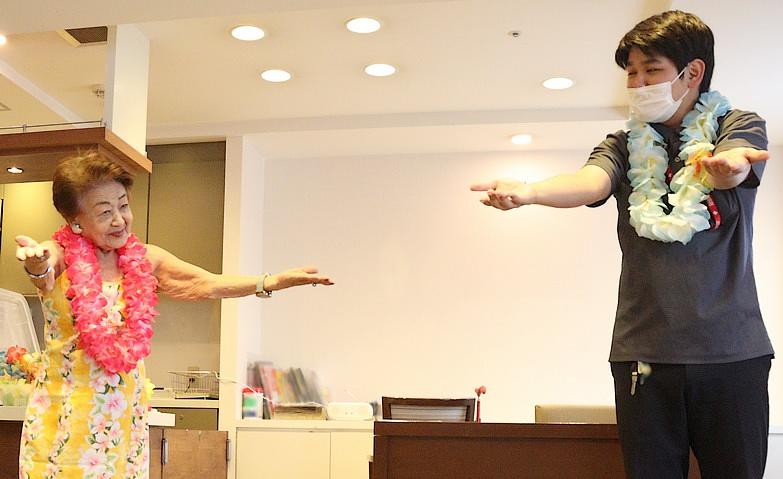 運動されるご入居者様 いつまでも心身ともに健やかに。「介護度進行予防運動」を実施しています
