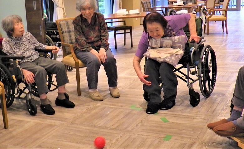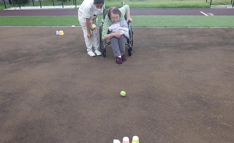 当ホームには1周約50mのアクティブコートがございます。芝生エリアやゴムチップ舗装のコート、訓練用の階段や屋根付きの休憩スペースも設置されています。リハビリとして歩行訓練ができるのはもちろん、天気のいい日にはグラウンド・ゴルフやボッチャなどグループでのアクティビティを行っており、ご入居者様それぞれが自由にのびのびと「お好きなこと」ができるような場所となっています。