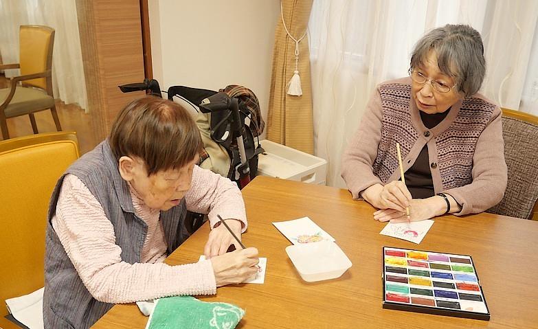 ホームで行うリハビリの中には、数名のご入居者様と機能訓練指導員が一緒に行う小集団リハビリがございます。「折り紙」「大人の塗り絵」「輪投げ」「ボーリング」など、お身体のご状態や目標、「やりたいこと」が近しいご入居者様が集まって行われるリハビリですので、リハビリ中のお時間もご入居者様同士の会話が弾み、皆様、目標達成を目指して楽しみながら、リハビリに取り組んでいらっしゃいます。
