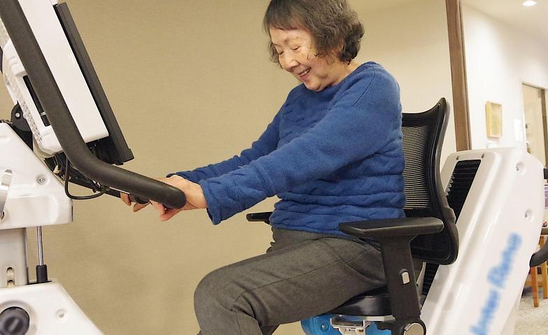 機能訓練指導員が作成する個別のプランのもとに行う個別リハビリでは、お身体の状態やご要望に合わせて、生活の質(QOL)の向上を目指した多様なプログラムを機能訓練指導員がご提案。このほかにも、足腰が不安な方の筋力維持を目的とした体操や、リハビリ機器を使用した運動などを通して機能向上や精神面(こころ)のサポートを図ります。歩行訓練などは、機能訓練指導員の作成したリハビリプランのもと介護職員が行い、安心感のある生活を送っていただけるようお手伝いをさせていただきます。
