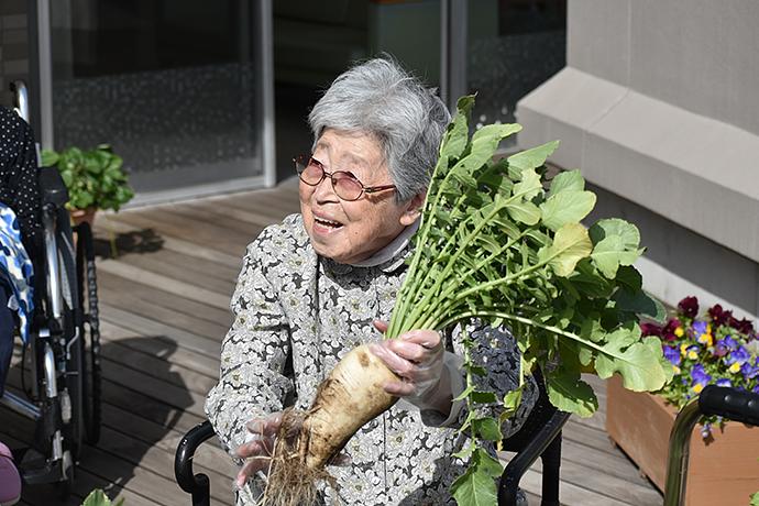 2階のウッドデッキでは、季節の野菜や草花を育てています。育てた野菜はご入居者様収穫から調理までしていただき、その日のお食事の一品として提供いただくことで、ホームから提供させていただくお食事以外の季節味覚はもちろん、調理自体も楽しんでいただけるよう、企画を検討、実施しています。