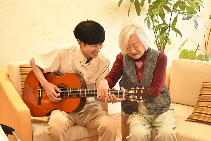 スタッフと音楽を楽しまれるご入居者様 その一瞬を楽しんでいただけるよう、環境づくりに努めています。