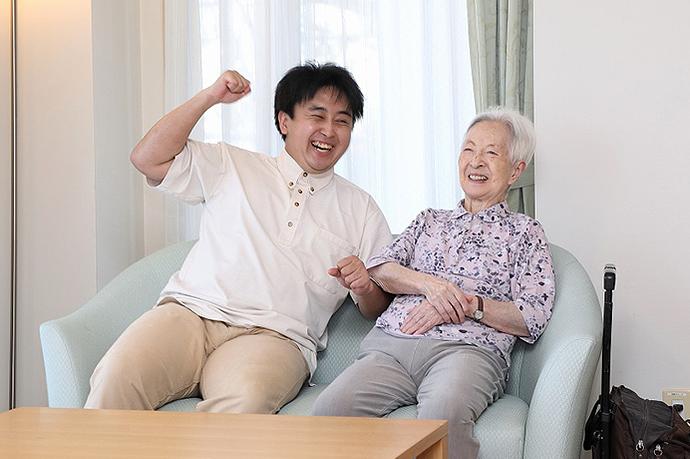 スタッフと談笑されるご入居者様 「くららの時間」で、お一人おひとりの「やりたい」を引き出し、実現に向けた取り組みを。