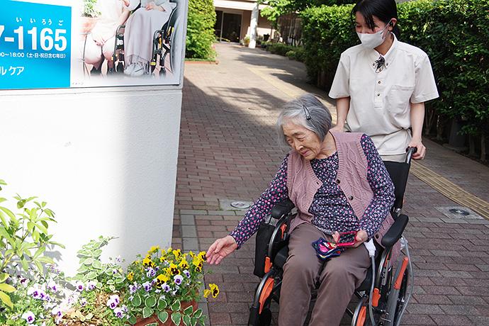 「ゆっくり話をしたい」「買い物に行きたい」「ドライブに行きたい」など、お一人おひとりの想いにできる限りお応えする『くららの時間®』※。スタッフと1対1で、他のご入居者様に気兼ねすることなく、ご自身のペースでお過ごしいただける時間を提供いたします。例えば、昔からお花を育てることがお好きだったご入居者様には、スタッフと一緒に花だんのお花を眺めたり、草木に触れたりする時間をご提案。お好きなことにゆったりと向き合っていただく時間を設けることで、よろこびを感じながらその方だけのひとときをお過ごしいただいています。