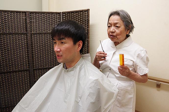 理髪店を営んでいたご入居者様に髪を切っていただいているスタッフ ご本人様・ご家族様の想いを大切にした「個別ケア」の取り組みに力を入れています。