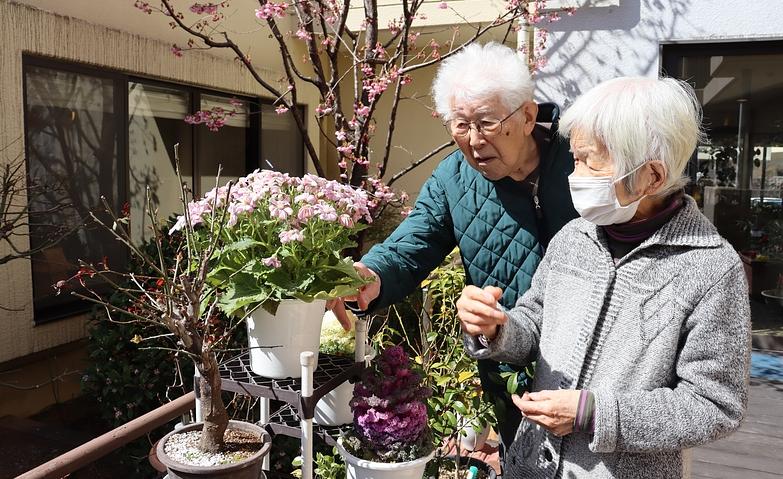 園芸を楽しまれるご入居者様のご様子 お仲間と一緒に育む楽しみを。緑や花に囲まれ、季節を感じられる環境です。