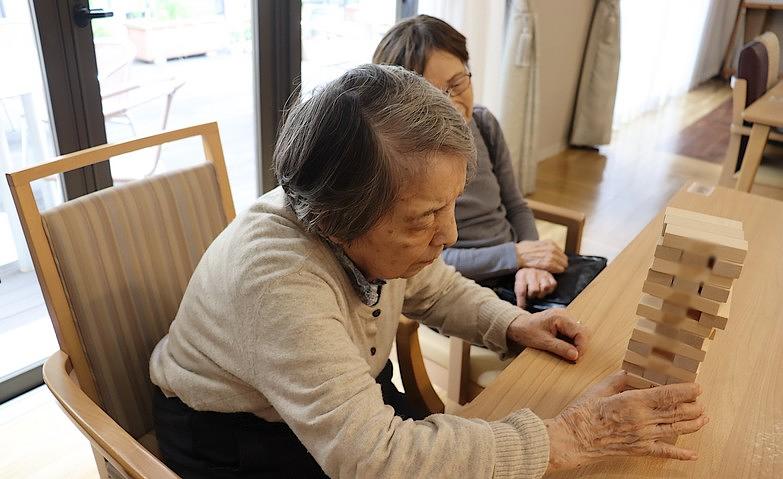 2025.07.06緊張の一手…!「倒さないように、揺らさないように」と緊張感が伝わるこの1枚。いつもは歓声が上がることの多いアクティビティの時間ですが、積み木ゲームの時は「しん…」と張り詰めた空気に変わります。お写真のK様も今まさにブロックを引き抜こうとされているとき。この後無事に引き抜かれ、「ほっ」と安心した表情をされていました。