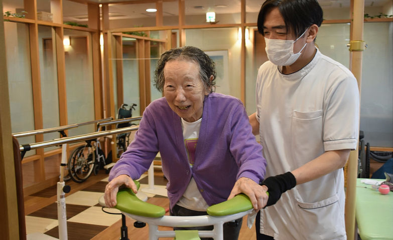 ご入居者様お一人おひとりのニーズやお身体の状態に合わせて、個別のリハビリプランをご提案、個別・集団・生活の3つのリハビリを組み合わせ、多彩なプログラムを実施いたします。マシンや道具を使用したリハビリだけでなく、介護職員が行う生活リハビリも併せてご提案いたします。ホーム内を活用した歩行訓練や、居室のベッドで行うリハビリ、頭や手指を使うようなリハビリも。その方が「今できること」の継続、そして「やりたいこと」への挑戦・実現につながるよう、身体機能の維持に努めてまいります。
