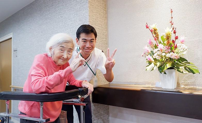 機能訓練指導員がご入居後約3ヶ月間、ご希望に応じて最大週5回の個別リハビリを行わせていただきます。ご入居者様が特に不安を感じられやすいご入居後3ヶ月間は集中的に個別で寄りそい、機能訓練指導員によるお身体のリハビリはもちろん、お散歩や趣味、傾聴など心のリハビリや生活リハビリ、個別ケアでサポートに努めます。ただの機能訓練ではなく、「孫の結婚式に自分の足で歩いて参列したい」など、その方の想いにそったお手伝いを心がけています。