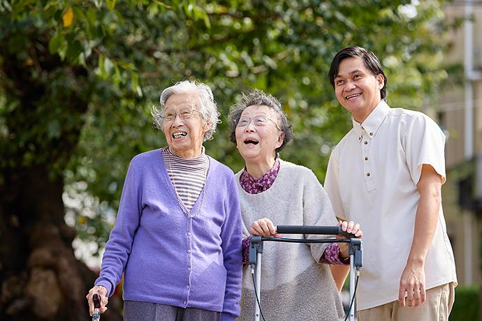 アクセス良好で商店が立ち並ぶ利便性に加え、緑あふれる憩いの場も点在する立地を生かし、お散歩アクティビティや屋外歩行リハビリを実施しています。機能訓練指導員が考案したリハビリ要素を取り入れたコースなど、目的に応じたお散歩コースもご用意。車いすの方にも介護職員が付き添い、安心感を持ってご参加いただけます。屋外での活動が気分転換になるだけでなく、「今度は〇〇に行きたい」「次はもっと歩けるように、リハビリをがんばろう!」と、日々の活力にも繋がっているようです。