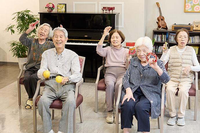 介護職員による「集団体操」に加え、外部講師による「リトミック体操」も定期的に実施しています。音楽を取り入れ、リズムに合わせてお身体を動かすことで無理なく・楽しく続けられる運動習慣づくりをお手伝いいたします。