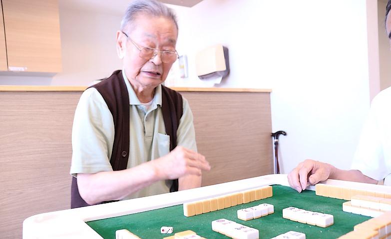 2025.10.01麻雀のリーグ戦開催!「本気で麻雀を打ちたい!」とおっしゃるご入居者様からのご希望もあり、今年度よりご入居者様2名、スタッフ1名、外部ボランティアの方1名で、麻雀のリーグ戦を行っております。麻雀の日になると誰よりも早く雀卓にいらっしゃり準備をされているS様。本日は高い手を連発され、大勝利を収められました。今年度はホーム内だけでなく、近隣のベネッセのホームとの交流戦も行っています。