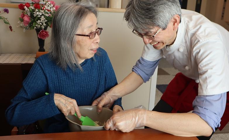 当ホームの料理クラブは、ご入居者様が主体となって運営しているクラブ活動です。皆様で自主的に集まって、開催日や献立、材料の買い物の内容などを決め、調理中も役割分担しながら手際よく進められています。スタッフは重い荷物を持つなど、できないことだけをお手伝いさせていただいています。食材に触れ、誰かを想いながらお料理を作っていただくことは、その方のハリにも繋がると考えています。ご入居者様に主体性を持って取り組んでいただけるような活動を増やすことで、いつまでもいきいきとした生活を送っていただけるよう努めてまいります。
