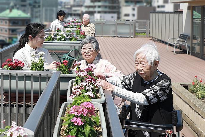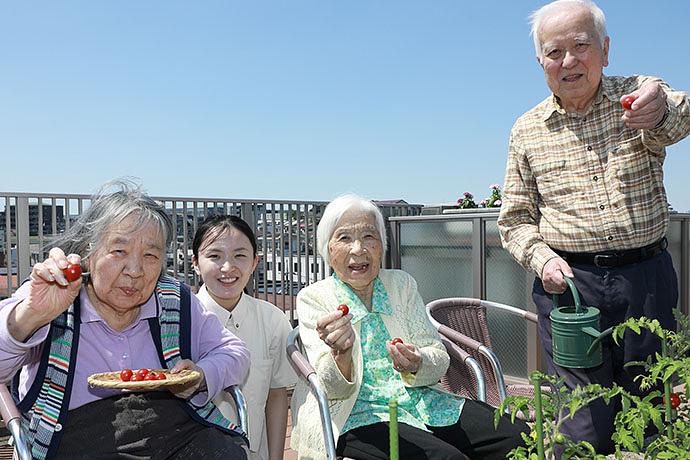 四季折々の花や家庭菜園が人気の屋上ウッドデッキ。家庭菜園では、ご入居者様が主体となって野菜を育てています。どんなものを育てるかは、ご入居者様主催の会議で相談して決めています。園芸のお好きなご入居者様が水やりや草取りなどの手入れをされ、成長を見守ってくださいます。ご自宅では当たり前のようにされてきた園芸を継続し、誰かの役に立っているというお気持ちから、生きがいや喜び、自信につながったとお話しくださるご入居者様も。