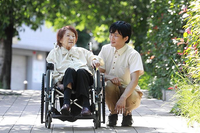 散歩されるご入居者様 1対1で充実した時間を過ごしていただける『くららの時間®』*