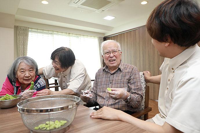 お料理のアクティビティでは、季節のメニューをスタッフが見守りながらご入居者様主体で料理をされています。準備が始まると、ご自宅のリビングのようにご入居者様が集合され、食材を洗う、包丁で切る、混ぜるなど、ご入居者様それぞれができることを分担してお料理をされています。