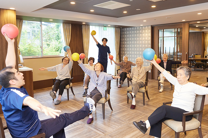 運動の専任スタッフが専門的な見地から運動プログラムを作成し、いまできることをいつまでもできるように、ご入居者様に楽しく無理のない運動を習慣化していただくことを目指しています。高齢期に低下しやすい運動機能・認知機能を包括的にトレーニングし、お身体を動かす楽しさや爽快感を体感しながら、皆様で一緒に運動を実施。また、通常年1回実施する「心とからだの健康検査」では、老化のサインを早期にキャッチし、健康生活の維持・向上に取り組んでいます。