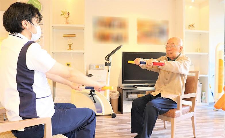 機能訓練指導員とリハビリをされているご様子 ご入居者様のお身体状態に合わせたリハビリ