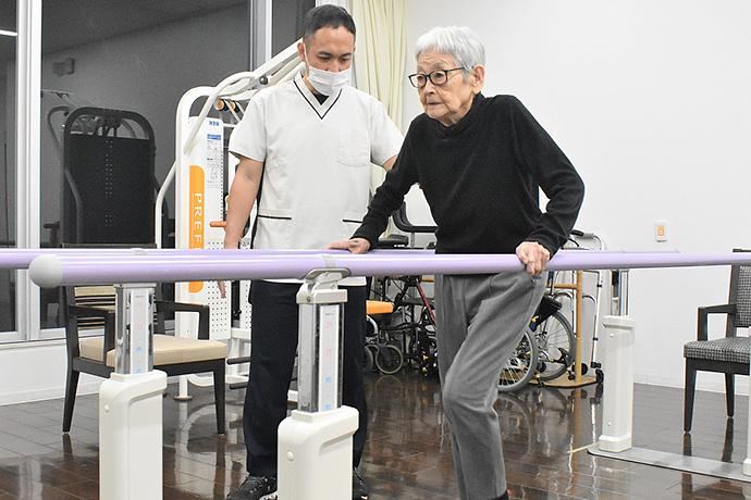 機能訓練指導員による個別リハビリは、ご入居者様お一人おひとりのお身体の状態をていねいに確認し、介護職員や看護職員など多職種のスタッフと連携しながら実施させていただいています。ご入居後のご不安な気持ちにも寄りそいながら、できるだけご本人様の持つ力を活かせるようサポートし、生活の質を維持・向上させるために、リハビリメニューのご提案やお身体に合わせた福祉用具の選定・使い方のアドバイス、居室環境の改善提案なども行ってまいります。