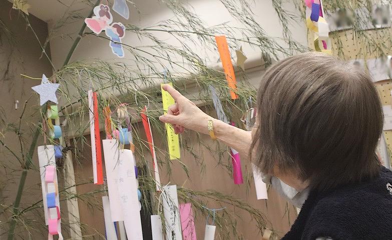 2025.07.24七夕の願いを込めてご入居者様にご自身の夢を書いていただき、短冊に願いを込めたご様子で飾られていらっしゃいました。飾ったあと、ご自身の短冊を見つけられ「いいところにあるわ、願いが叶いそうね」とおっしゃっていらっしゃいました。