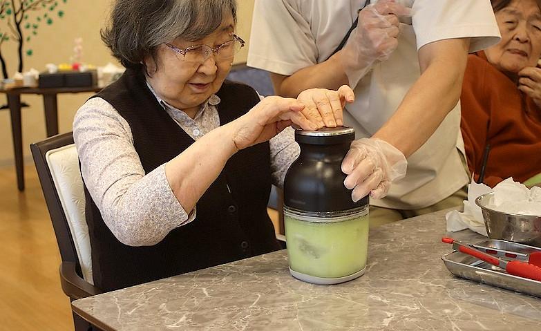 2025.09.18「これで作れるの⁉」アイスクリームを作るアクティビティに参加されたご入居者様。フードプロセッサーを使用したアイスクリーム作りに挑戦です。初めてご覧になる機械に、「これで本当にアイスクリームが作れるの⁉」と驚かれたご様子。少し緊張していらっしゃるようでしたが、アイスクリームができあがると、「できた!すごいわね」とうれしそうにおっしゃっていました。