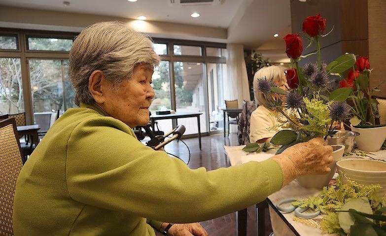 午後は、集う時間を設け、さまざまなアクティビティを実施しています。歌の会や書道、園芸、写生、百人一首、脳トレ、フラワーペーパー作りなど、ご入居者様のやりたいことを募りながら、日々の暮らしの中に楽しみを持って過ごしていただけるよう、企画させていただいています。