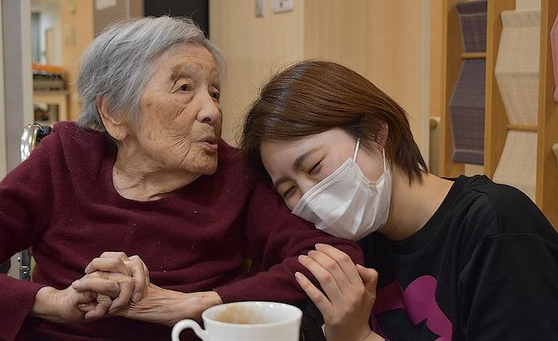 車椅子の方に寄りそい話しかけられるご入居者様 1フロア15名程度のグループケアでアットホームな雰囲気
