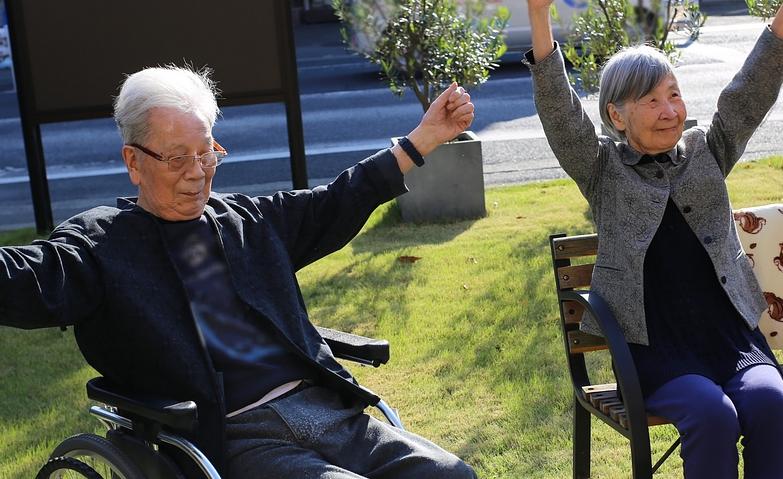 玄関前の芝生の上で青空体操 お仲間やスタッフと、明日が楽しみになる生活を