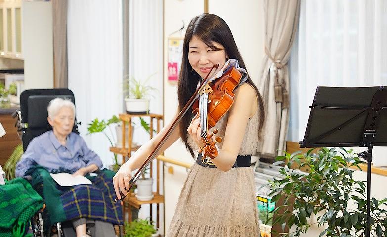 2025.09.18ヴィオラコンサート先日、外部よりヴィオラ奏者の方をお招きし、コンサートを開催しました。ヴィオラは人間の声に近い音といわれている、やわらかい音色の楽器です。コンサートをお聴きになられたご入居者様は、目を閉じて聴き入ったり、一緒に口ずさんだりと、とても楽しまれているようでした。