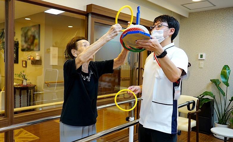 2025.08.14機能訓練指導員によるリハビリ②機能訓練指導員とご入居者様で行っている個別リハビリの様子です。立ち姿勢で機能訓練指導員の持っている棒に輪を通していただくことで、立位でのバランス感覚を鍛えたり、肩関節の可動域を保つことを目的としています。ホームではご入居者様のお身体の状態に適したリハビリメニューをご提案しています。