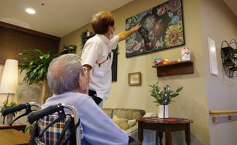 2025.08.13黒板アートご入居者様がスタッフと一緒に黒板アートをご覧になっているご様子です。玄関付近にあるこの黒板アートは、スタッフが季節によって絵柄を描きなおしています。ホームにいらっしゃった際はぜひご覧くださいませ。