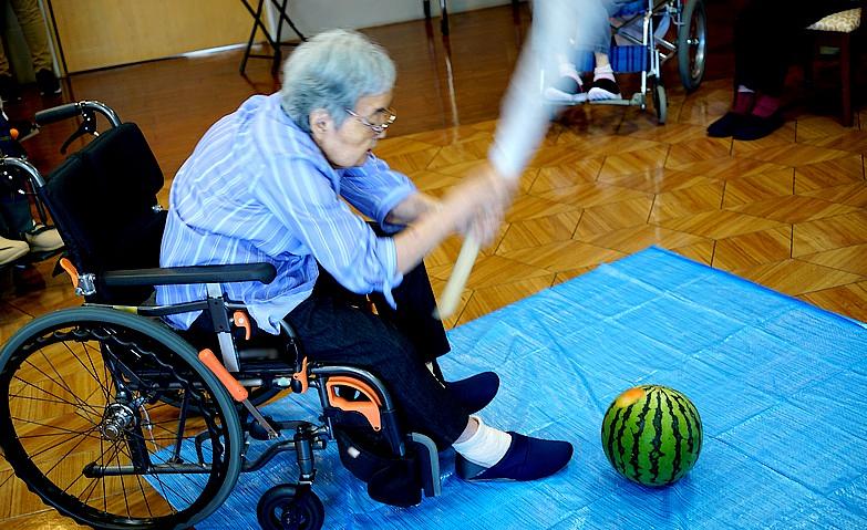 2025.07.24スイカ割りをしましょう!先日、スイカ割りのアクティビティを行いました。大きくてかたいスイカだったため、ご入居者様の皆様は交代で木刀をふり、協力しながらスイカを割られました。パカッと割れると、参加された皆様から大きな歓声が上がりました。そのあとはスタッフがカットしたり、ジュースにして皆様に召し上がっていただきました。