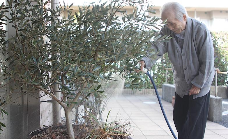 花を観賞するご入居者様 ホーム自慢の中庭で季節の花を皆様と一緒に育て、その成長が皆様の楽しみになっています。