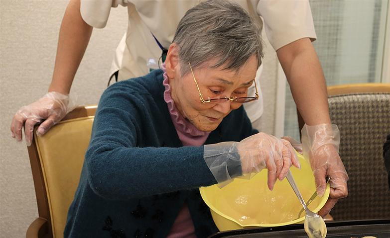当ホームのお料理クラブ「ビストロ神楽坂」。通常毎月の活動では、お料理を楽しんでいただいています。包丁を使用し、「もうちょっと味は薄い方がおいしいわよ」「この野菜はこうやって切るのよ」など、スタッフも教わりながら、そばで見守り、難しいところをお手伝い。私たちは、すべてをお手伝いするのではなく、その方のお力を発揮していただきながら、ご入居者様の自発的なお気持ちを大切にした「ちょうどいいお手伝い」を心がけています。できることは極力ご自分で行っていただくことで「その方らしさ」を大切にし、いつまでもお料理を楽しんでいただけるよう努めてまいります。