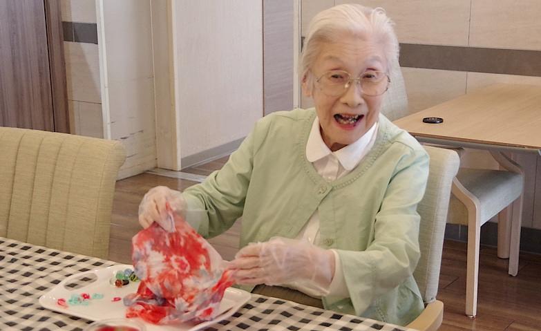 2025.09.09染物サークル当ホームで定期的に開催している染物サークルのご様子です。今回の作品は、夏をイメージして赤色の染料を多く選ばれたそうです。できあがった絞り染めの作品を広げて、出来栄えを見せてくださいました。とても鮮やかな夏に似合う作品が完成しました。
