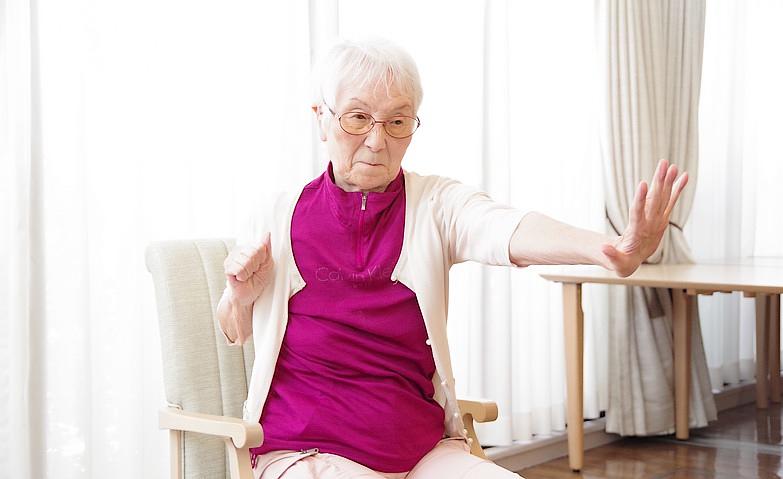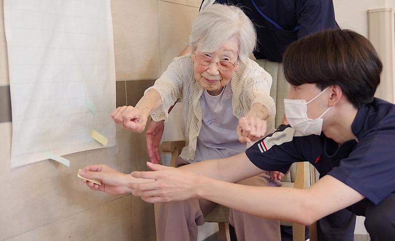 2025.07.31介護度進行予防運動~いすに座ってゆっくりと~通常毎週月曜日に開催されている介護度進行予防運動に参加されているご入居者様。いすに座ってゆっくりとした音楽をかけながら、運動の専任スタッフの掛け声に合わせてお身体を動かされています。「運動を続けてまた歩けるようになることが目標」と笑顔でがんばっていらっしゃいます。