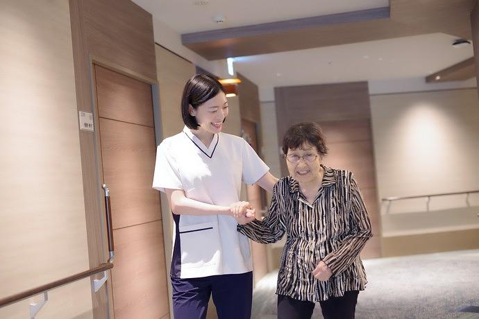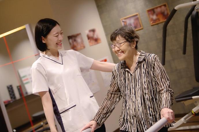 機能訓練指導員が作成する個別のプランのもとに行う個別リハビリでは、お身体の状態やご要望に合わせて、生活の質(QOL)の向上を目指した多様なプログラムを機能訓練指導員がご提案。このほかにも、足腰が不安な方の筋力維持を目的とした体操や、リハビリ機器を使用した運動などを通して機能向上や精神面(こころ)のサポートを図ります。歩行訓練などは、機能訓練指導員の作成したリハビリプランのもと介護職員が行い、安心感のある生活を送っていただけるようお手伝いをさせていただきます。