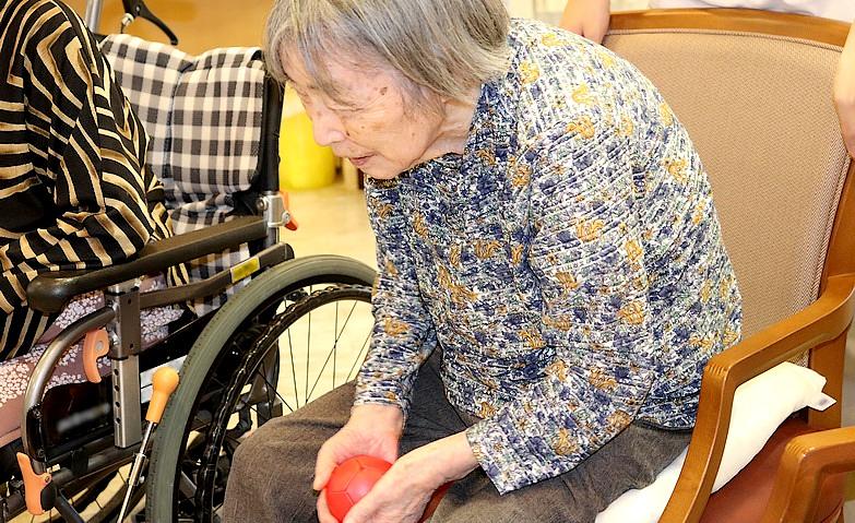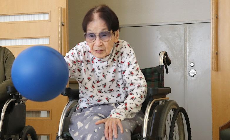 2025.10.01リハビリボール体操!昔から運動が得意だったA様。この日は、皆様と一緒にボールを使用したリハビリボール体操を行いました。100歳を超えた今でも、目の前に飛んできたボールをしっかりキャッチされ、笑顔で体操に取り組まれています。