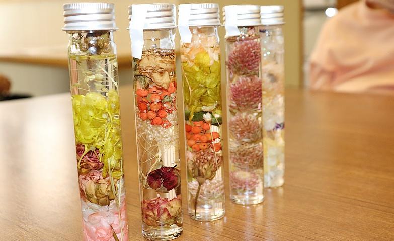 2025.09.18夏のハーバリウムづくり!この日は、ご家族様から寄贈いただいた材料を使い、ハーバリウム作りを行いました。色鮮やかな材料のなかから、皆様思い思いにお花を選び、ボトルの中に入れていかれました。「こうやって作るのね!」と終始笑顔でお話しされ、ハーバリウム作りを楽しまれたご様子でした。