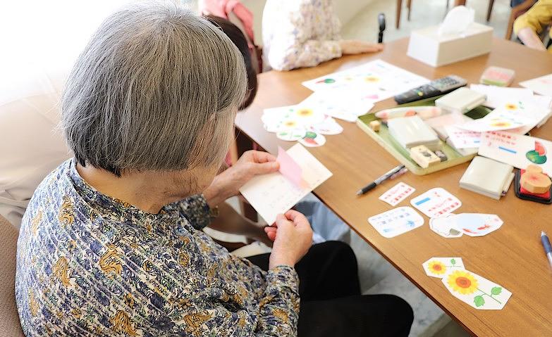 2025.08.29残暑お見舞い申し上げます!通常毎年恒例の絵葉書作りのご様子です。はがきには、季節にちなんだハンコを押したり、イラストで飾り付けを行いました。完成したはがきにメッセージを書いていただき、ご家族様へお送りすることをお伝えすると、皆様は笑顔で「お願いね」とおっしゃってくださいました。