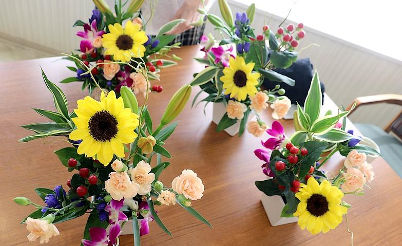 2025.08.148月のお花の会先日、8月のお花の会を開催しました。今回は、夏のお花を皆様思い思いに生けてくださいました。お互いの作品を鑑賞され、「あー、こんな生け方もきれいね」と感想を言い合っていらっしゃいました。生けたお花を居室に飾らせていただくと、「お部屋が明るくなるね」と喜んでくださったようです。