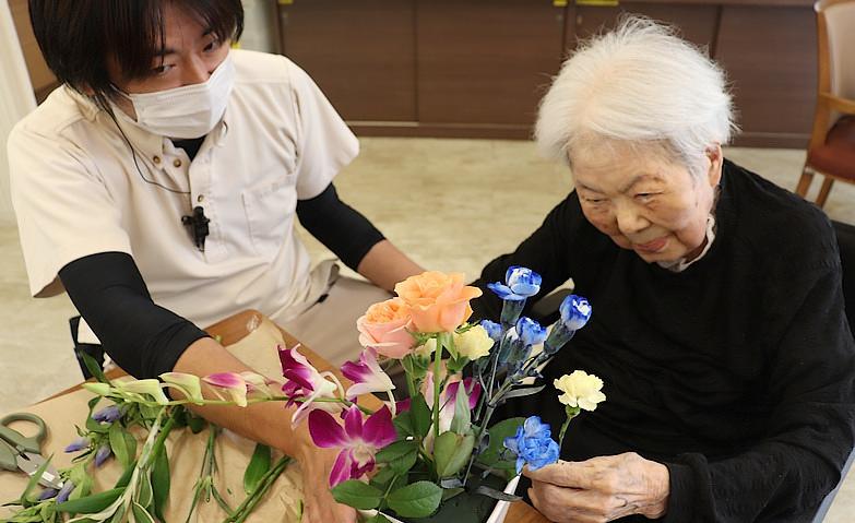 2025.09.03フラワーアレンジメント教室通常毎月開催している、フラワーアレンジメント教室のご様子です。スタッフと一緒に一生懸命お花を生けていらっしゃるご入居者様。「きれいですね、何色がお好きですか?」とお聞きすると、少し悩まれて「全部ですね」と笑顔で答えてくださいました。完成した作品をお部屋に飾らせていただくと、ほほ笑んでいらっしゃいました。